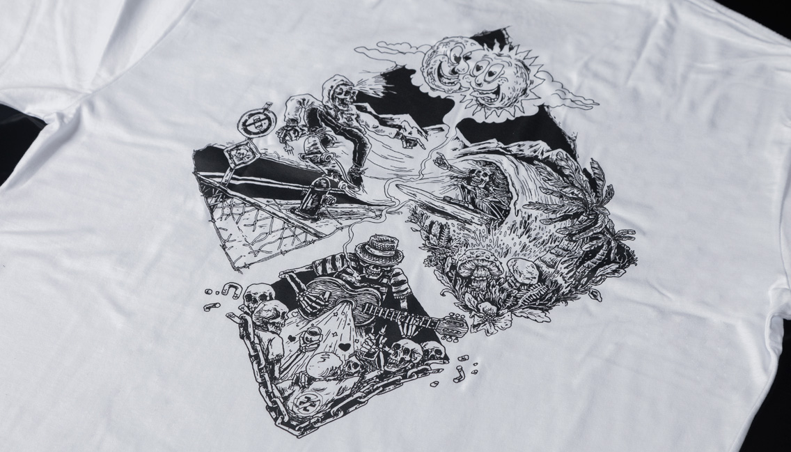 O segundo artista a colaborar foi Marcio Moreno. Ilustrador sinistro e também irmão da família, deu vida a estampa da camiseta Universo (branca), que retrata TUDO que a marca representa.